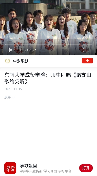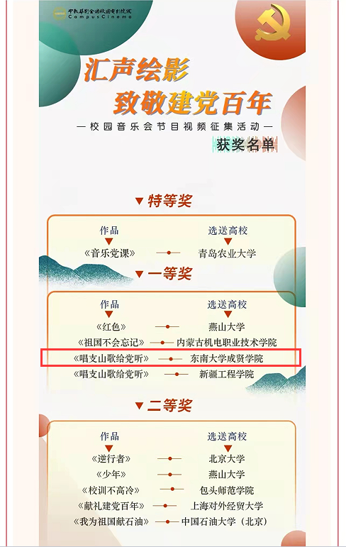 2020年4月,《唱支山歌给党听》MV由校团委联合党政办公室、党委组织部、党委学工部共同策划,大学生艺术团精心编排摄制。作品情感真挚浓烈,用红色旋律唱出时代力量,以青春之歌礼赞建党百年,唱出了新时代的力量和爱党爱国的热情,展现了东大成贤学子积极昂扬的青春风貌。