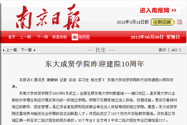 【南京日报】东大成贤学院昨迎建院10周年