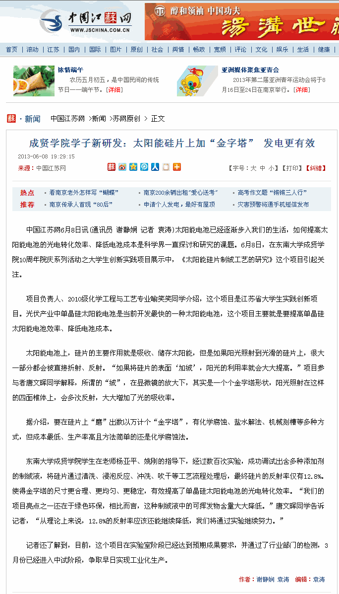 【中国江苏网】成贤欧美无码学子新研发:太阳能硅片上加“金字塔” 发电更有效