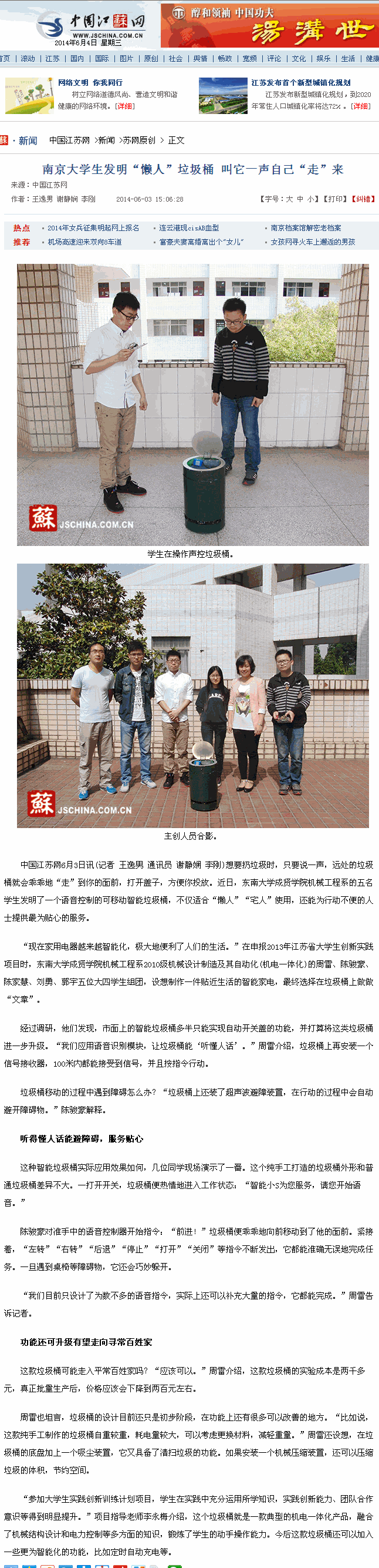 【中国江苏网】南京大学生发明“懒人”垃圾桶 叫它一声自己“走”来