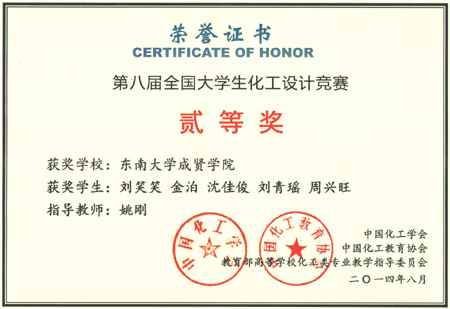 2014年“恒逸—三井化工杯”第八届全国大学生化工设计竞赛中,化工与制药工程系ChemRun代表队喜获全国设计大赛二等奖。