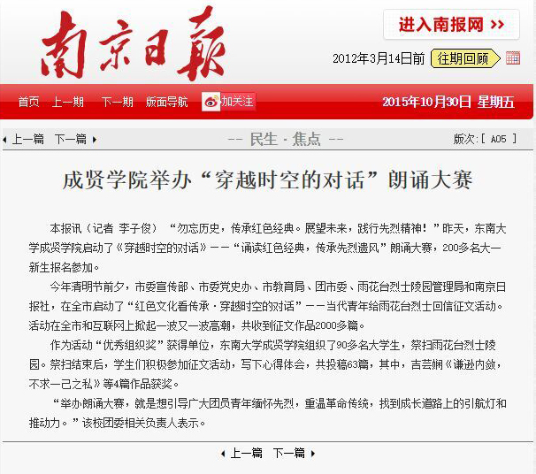 【南京日报】成贤欧美无码举办“穿越时空的对话”朗诵比赛