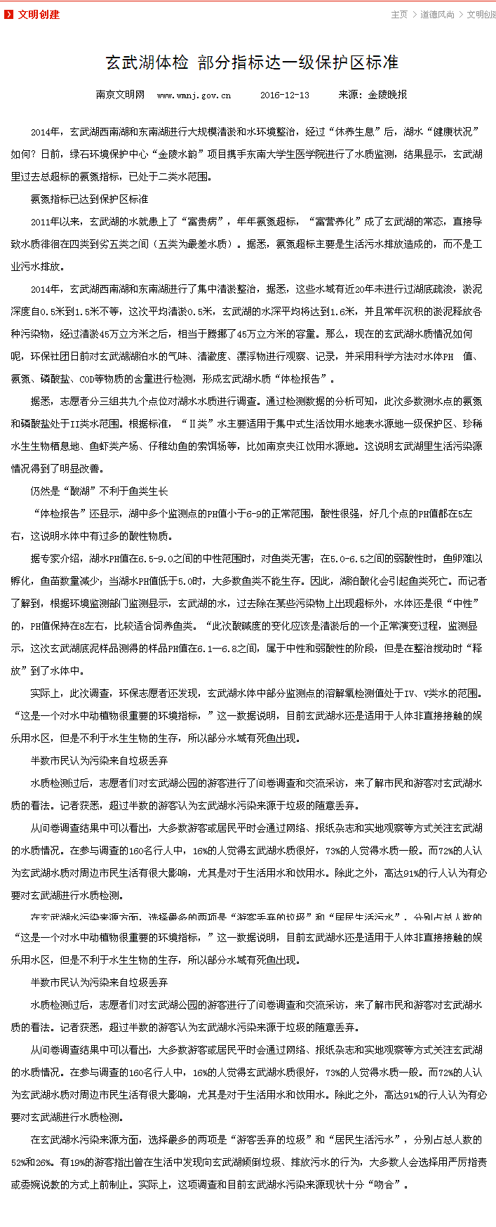 【南京文明网】玄武湖部分指标达一级保护区标准