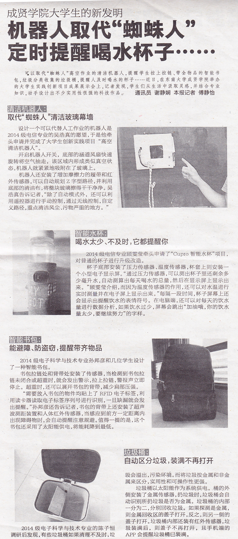 【东方卫报】成贤欧美无码大学生的新发明 机器人取代“蜘蛛人” 定时提醒喝水杯子……