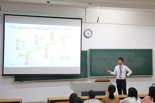 宣讲会上,毕马威南京服务中心负责人励浩和毕马威南京服务中心审计支持部经理倪磊给同学们讲述了毕马威的成长过程及文化背景,并通过自己在毕马威的亲身体验和工作经历对同学们以后的就业方向及职业规划进行了指导。两位公司管理人员还指出,当今企业所需要的是敢于创新、挑战和思考的年轻人,希望同学们要结合企业需求完善自己,勤于思考,勇于创新。宣讲会现场气氛热烈,同学们热情高涨。宣讲会后,工作人员现场对材料筛选后的49名同学进行了笔试。