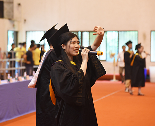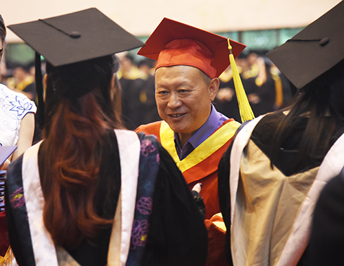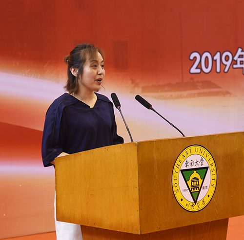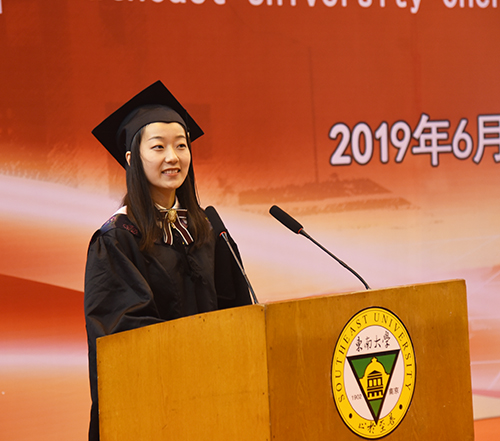 毕业生代表2015级会计专业1班贺斯琪同学代表全体毕业生感谢母校为学生成长成才所提供的氛围与环境,所有人将怀揣着对母校的不舍之情,在今后的道路上与“求真求美,成人成贤”的成贤精神时刻相随,梦想常青,担当常在。