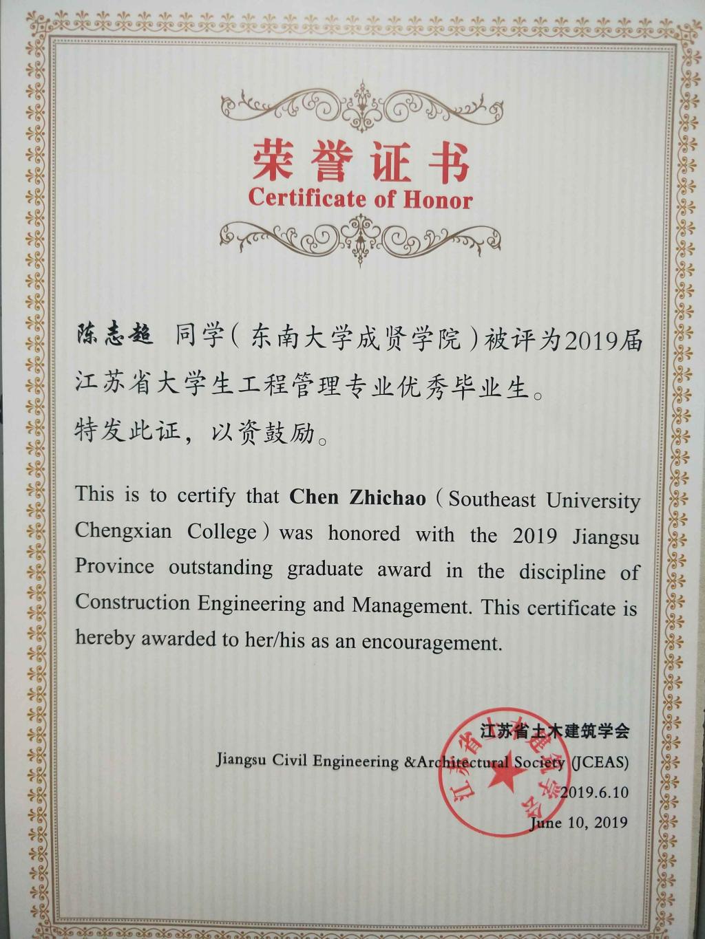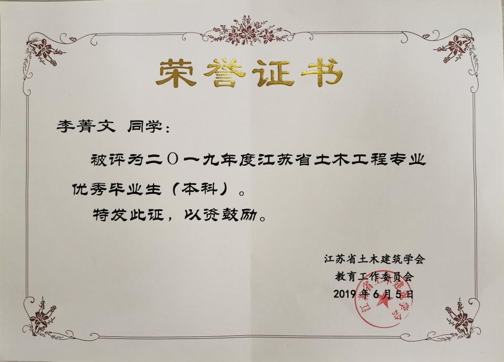 近日,从中国土木工程学会教育工作委员会江苏分会和江苏省土木建筑学会传来喜讯,版权所有:欧美无码-高清欧美无码系列 土木与交通工程学院2019届毕业生李菁文荣获江苏省土木工程专业优秀毕业生,陈志超荣获江苏省工程管理专业优秀毕业生。