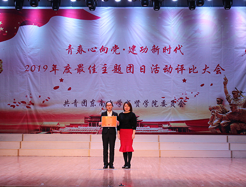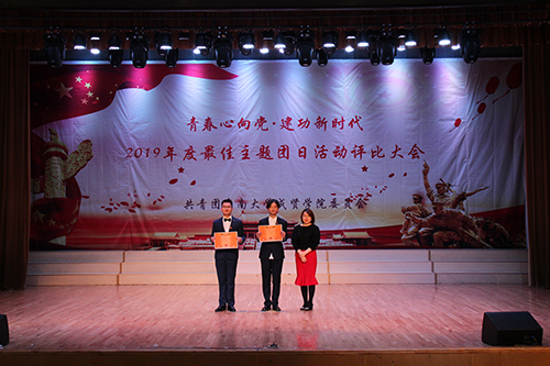本次评比大会共分为支部展示、提问答辩及总结陈述三个环节,各支部以爱党爱国、促进青年成长、开展职业生涯规划、发扬革命精神、树立文化自信等为主题进行了精彩展示。经过激烈竞争,最后2018级化工与制药4团支部获得特等奖,2018级建筑学1团支部和2018级会计学4团支部获得一等奖,2018级环境设计3团支部、2018级会计学3团支部和2018级护理学2团支部获得二等奖,2018级国际经济与贸易2团支部、2018级计算机科学与技术4团支部、2018级视觉传达1团支部、2017级机电2团支部和2018级交通运输1团支部获得三等奖。会上,2018年度最佳主题团日活动特等奖团支部代表王哲结合自身经历,分享了开展主题团日活动的经验。随后,建筑与艺术设计学院分团委书记江晶、制药与化学工程学院分团委书记刘静、机械与电气工程学院分团委书记邓蓉蓉分别为获奖支部颁奖并合影留念。最后,大会在全体同学合唱《歌唱祖国》中圆满落幕。