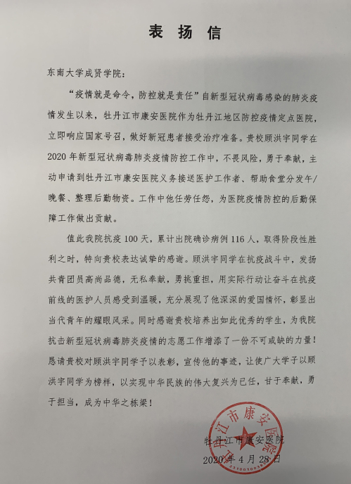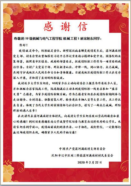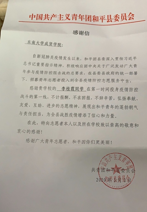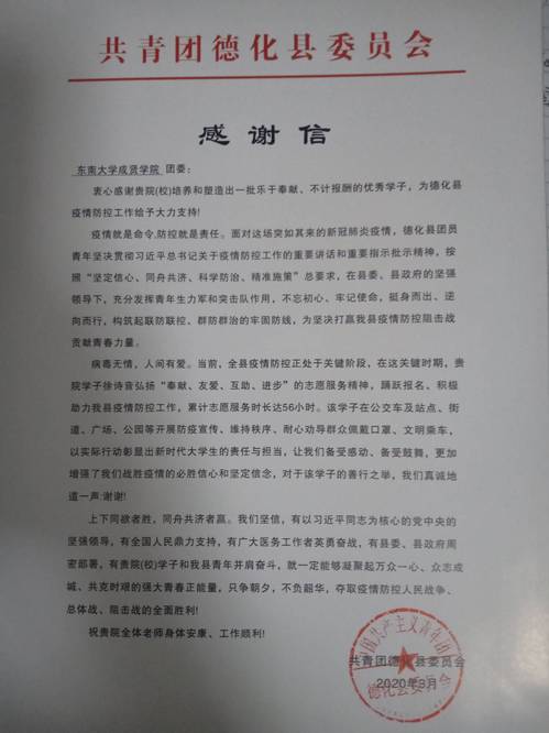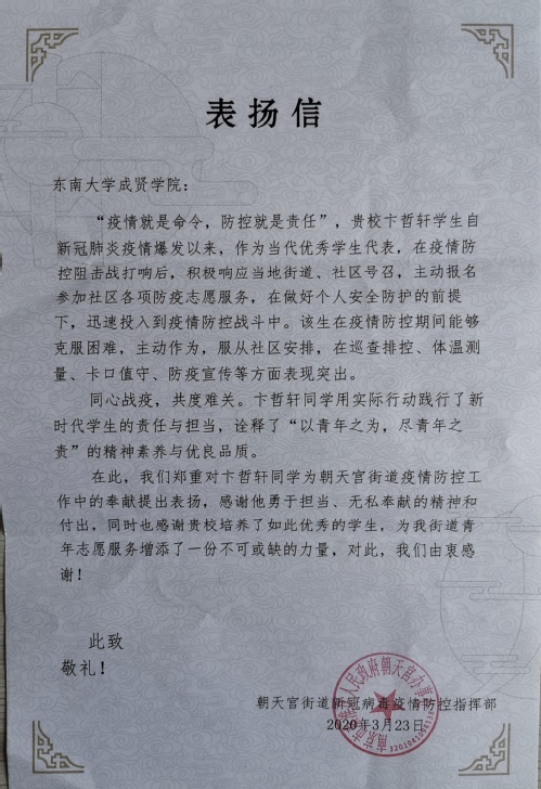 疫情期间,返乡的成贤学子在做好自身安全防护的基础上,积极参与家乡的疫情防控工作,有的深入基层进行疫情排查和防控,有的热心捐款捐物,还有的协助地方公安、医疗卫生、交警等部门开展各种形式的志愿服务活动。各单位的来信中,对学生们在抗击疫情中做出的大量工作表示感谢,对他们无私奉献的精神表示赞许。
