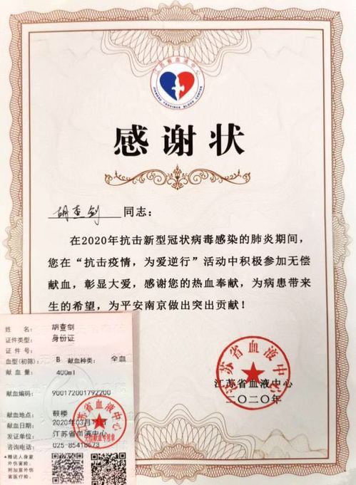 来自江苏省血液中心的感谢信