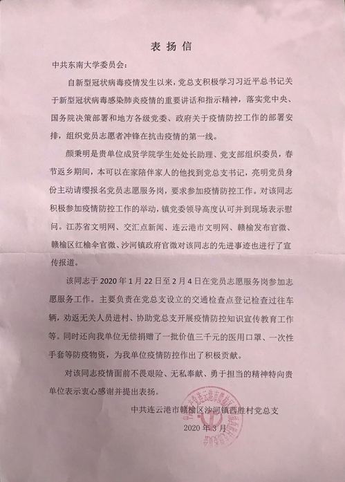 连云港市赣榆区沙河镇西胜村党总支在感谢信中写道:颜秉明老师春节返乡期间,主动请缨,扛起责任,报名参加党员志愿服务岗,在交通检查点登记检查过往车辆、劝返无关人员进村、协助开展疫情防控知识宣传教育工作等。同时,还向村里无偿捐赠了一批价值3000元的防疫物资。他的先进事迹被江苏省文明网、交汇点新闻等多家媒体宣传报道。