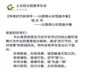 为认真贯彻落实习近平总书记关于“坚决制止餐饮浪费行为,切实培养节约习惯”的重要指示精神,引导广大师生发扬厉行节约、艰苦奋斗的作风,营造爱惜粮食、杜绝浪费的氛围,党委学工部和团委组织开展了“厉行节约,反对浪费”主题教育活动,向全校同学发出“厉行节约,反对浪费”倡议书并组织开展“百城千校光盘行动挑战赛”活动,各学院根据主题教育活动要求积极开展形式多样的教育活动。