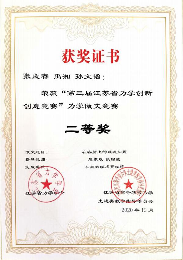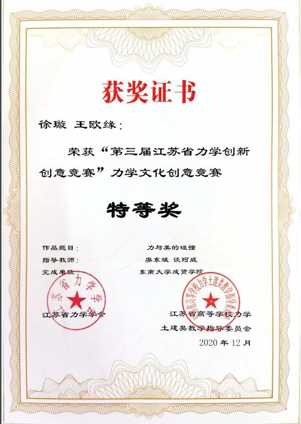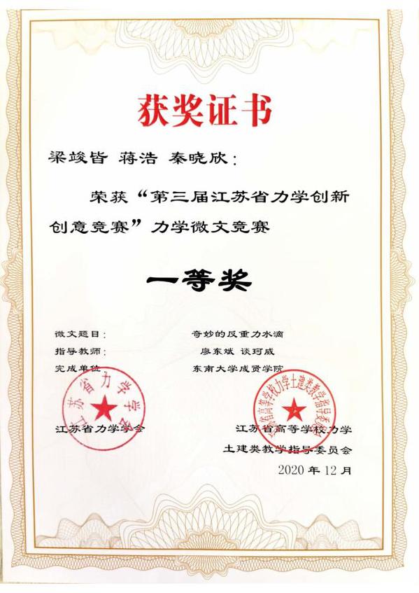 近日,“第三届江苏省力学创新创意竞赛”评审工作落下帷幕。欧美无码 土木与交通工程学院廖东斌、谈珂威、陈亮三位老师积极组织,精心备赛,在他们的指导下,徐璇、王欧缘两位同学的作品《力与美的碰撞》获力学文化创意竞赛特等奖(第一名),梁竣皆、蒋浩、秦晓欣三位同学的作品《奇妙的反重力水滴》获力学微文竞赛一等奖,李文涛、胡玮、沈伟伟三位同学的作品《不“科学”的科学》以及张孟睿、禹湘、孙文韬同学的作品《在客船上的跳远问题》获力学微文竞赛二等奖。