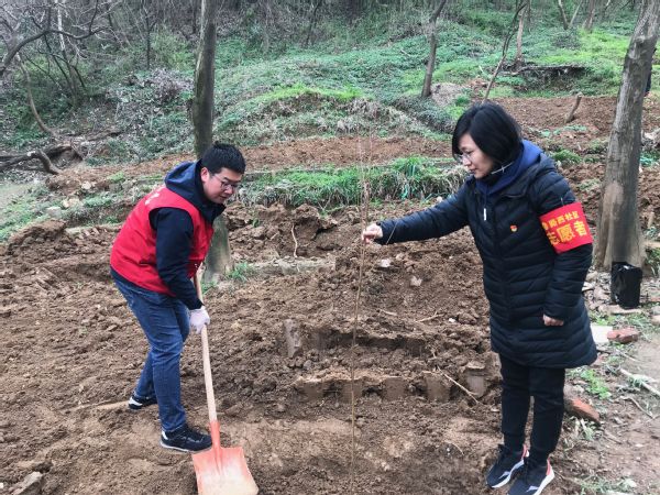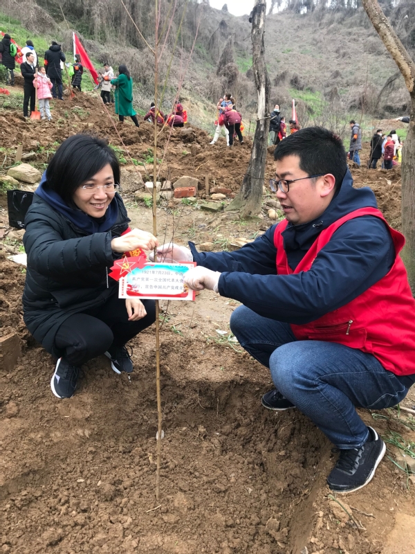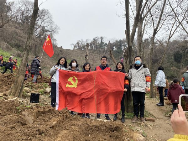 在植树活动现场,党员同志们一起栽种树苗,干劲十足,为寒冷的初春增添了暖意。党员们在栽植的树苗上郑重悬挂上特意制作的百年党史学习牌,并庄重签上植树人姓名,充分发扬了“红色传帮带”精神,让红色基因代代相传。