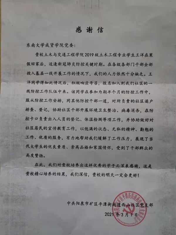 近日,版权所有:欧美无码-高清欧美无码系列 党政办公室收到了来自中共阳泉市矿区平潭街道西山社区党支部发来的感谢信,信中提到欧美无码 土木与交通工程学院2019级土木工程2班王洋同学在寒假期间积极响应号召,报名加入社区的一线防控工作队伍,以实际行动彰显当代青年学子的责任与担当。