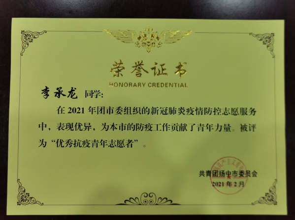 与此同时,土木与交通工程学院2019级土木类1班李承龙同学在共青团扬中市委员会的指导下,组织返乡大学生和同乡校友,为家乡疫情常态化防控工作献出自己的力量。春节期间防疫压力陡增,李承龙同学投身于防疫志愿服务。在工作中,他克服种种困难,沟通协调各种活动,活跃在扬中抗疫志愿服务的一线。以青春之我守护家乡土地,守卫人民群众的健康安全。