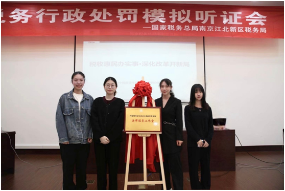 428日,正值全国第30个税收宣传月,经济管理学院税收学专业凌一行、叶丹丹、熊睿、古伟玲四位同学在刘振艳老师的组织下,作为大学生代表参加由江北新区税务局举办税务行政处罚模拟听证会暨法律服务工作室揭牌仪式。