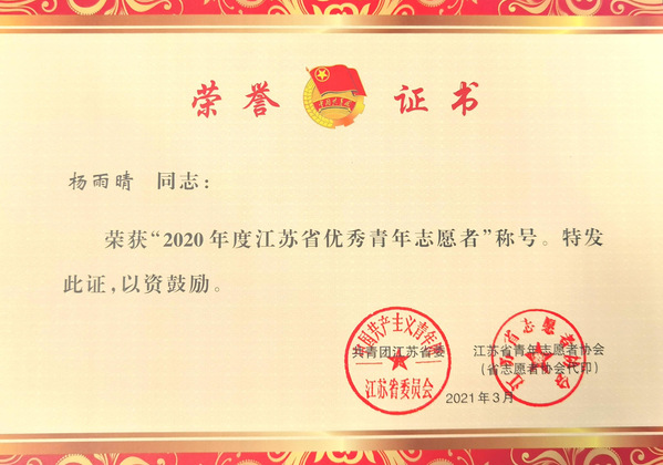 杨雨晴获“2020年度江苏省优秀青年志愿者”荣誉称号