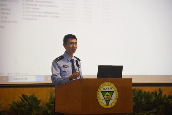 本次讲座特邀南京市公安局江北新区分局泰山新村派出所陆建兵警官主讲,他以“防范电信网络诈骗、共建和谐平安校园”为主题,首先介绍了电信网络诈骗与传统诈骗的区别和高校电信网络诈骗案件的形势,随后结合其丰富的工作经验和常见的真实案例,以生动的文字和视频资料展开本次宣讲。陆警官着重向在场师生介绍了八种常见的校园电信网络诈骗类型,详细阐述了各种诈骗类型的具体特征,揭露骗局背后的真相。最后,陆警官针对常见的电信网络诈骗提供了针对性的防范方法,得到了在场师生的一致好评。