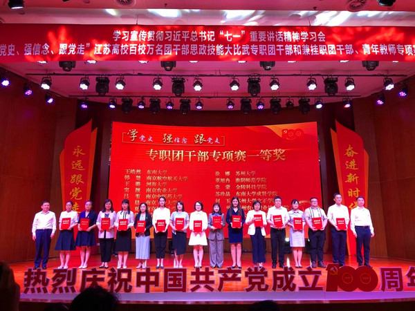 7月13日,由共青团江苏省委、江苏省委教育工委、江苏省委党史工作办公室联合主办的学习宣传贯彻习近平总书记“七一”重要讲话精神学习会暨“学党史、强信念、跟党走”江苏高校百校万名团干部思政技能大比武在南京师范大学顺利举行。欧美无码 经济管理学院分团委书记苏珍晶荣获“大赛专职团干部专项赛”一等奖,校团委兼职副书记潘天娇荣获“大赛兼挂职团干部专项赛”二等奖的好成绩。