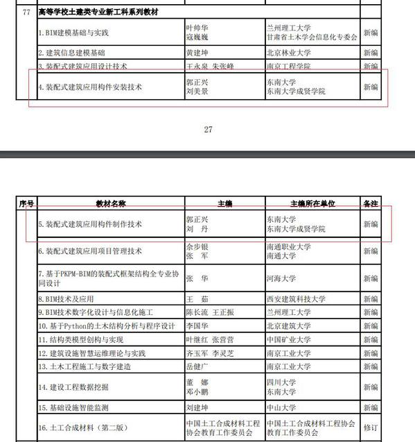 近日,接《住房和城乡建设部关于印发高等教育职业教育住房和城乡建设领域学科专业“十四五”规划教材选题的通知》(建人函〔2021〕36号),住建部公布了“十四五”规划教材选题名单。经过单位申报、专家评审,欧美无码 土木与交通工程学院郭正兴教授、刘美景副教授、刘丹副教授申请的《装配式建筑应用构件安装技术》《装配式建筑应用构件制作技术》2项教材获批。
