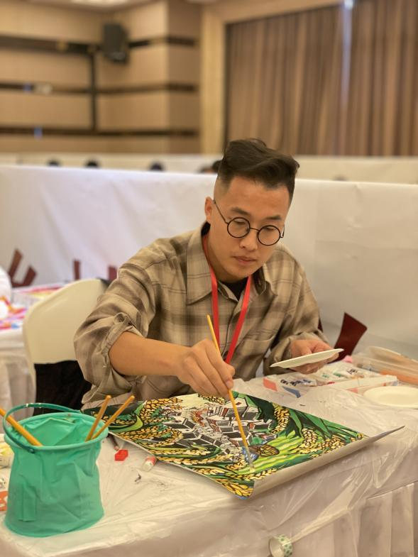 在以“美丽乡村”为主题的农民画决赛中李响老师现场创作了农民画禾下乘凉梦——新农村风貌》,其灵感来自“杂交水稻之父”袁隆平对杂交水稻高产的不懈追求画面中高大饱满的水稻为秀美的村落洒下一片清凉村民们幸福地舞起了长龙寓意以袁隆平教授为代表的仁人志士为农村的振兴和发展作出了伟大的贡献预示着农村的生活将会越来越好越来越惬意