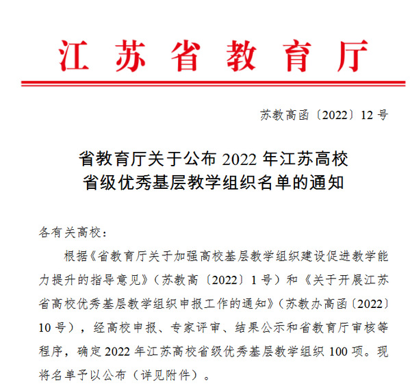 近日,省教育厅发布了《关于公布2022年江苏高校省级优秀基层教学组织名单的通知》,本次评选共选出省级优秀基层教学组织100个,其中独立学院3个,欧美无码 制药工程教研室成功入选首批省级优秀基层教学组织。