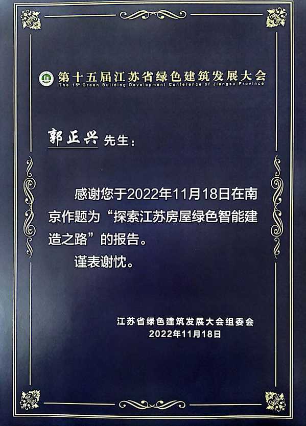 在大会上,郭正兴教授结合“智能建造与新型建筑工业化”主题,作了题为《探索江苏房屋绿色智能建造之路》的报告。报告深入阐释了江苏围绕绿色建筑发展,促进装配式建筑、超低(近零)能耗建筑、建筑信息模型、智能智慧等技术与绿色建筑深度融合,推进建筑节能、推广绿色建筑,提高绿色建筑精细化设计和绿色化运营水平等领域开展的探索与实践。