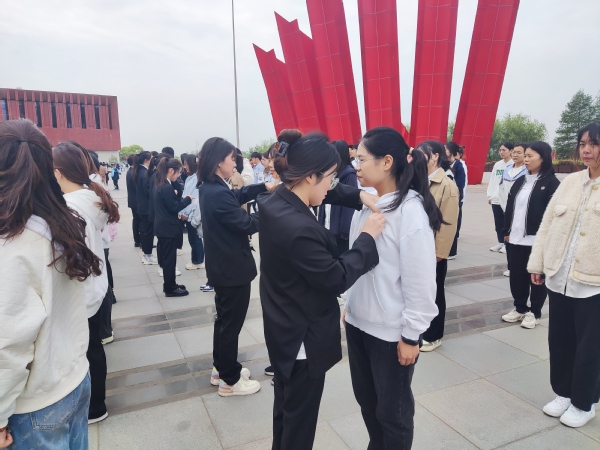 老团员同学给新团员同学佩戴团徽