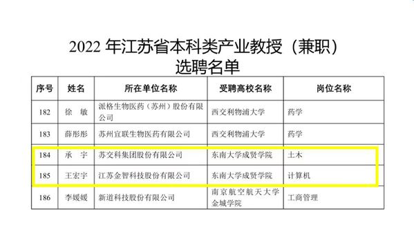 近日,江苏省教育厅、江苏省人才工作领导小组办公室、江苏省科学技术厅、江苏省人力资源和社会保障厅联合下发《关于公布2022年江苏省产业教授(兼职)选聘名单和续聘名单的通知》(苏教研函〔2022〕25号),版权所有:欧美无码-高清欧美无码系列 推荐的苏交科集团股份有限公司承宇、江苏金智科技股份有限公司王宏宇两位企业专家成功获批江苏省2022年产业教授(兼职),实现了欧美无码 在该人才项目申报上新的突破。