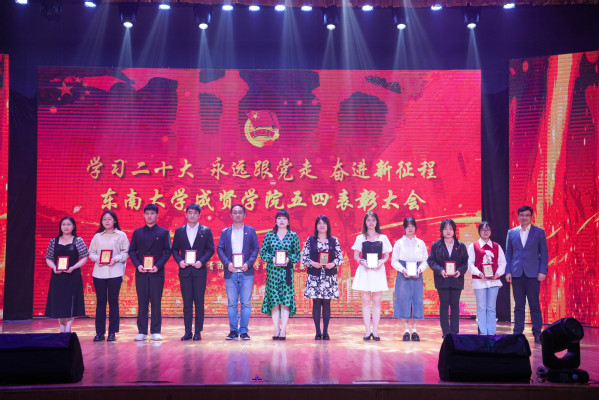 大会中,王荣副书记为“五四红旗团委”和“优秀团务工作者”颁奖,施杰部长分别为荣获“魅力团支书”“优秀共青团干部”和“优秀共青团员”的代表颁奖,团委书记潘明烽宣读表彰决定并为“优秀护旗手”“五四青年奖章”颁发证书。《青春·志愿》节目邀请了后勤管理处副处长丁秀山、毕业生刘昊和大四毕业生、原志工部部长罗倩进行了访谈,分别从疫情防控、公益献血、乡村振兴、公益支教、校地共建公益活动等方面分享了各自的志愿服务经历,讲述了属于他们的青春故事。活动中,歌曲《有我》《破浪》、朗诵《我愿为此,奋斗终身》《书写青春华章》、舞蹈《new youth》给现场师生带来了视听盛宴,表达了要与这个时代主题同心同向的理想信念,要勇担这个时代赋予的历史责任,励志勤学、刻苦磨炼,在激情奋斗中绽放青春光芒、健康成长进步的愿望。