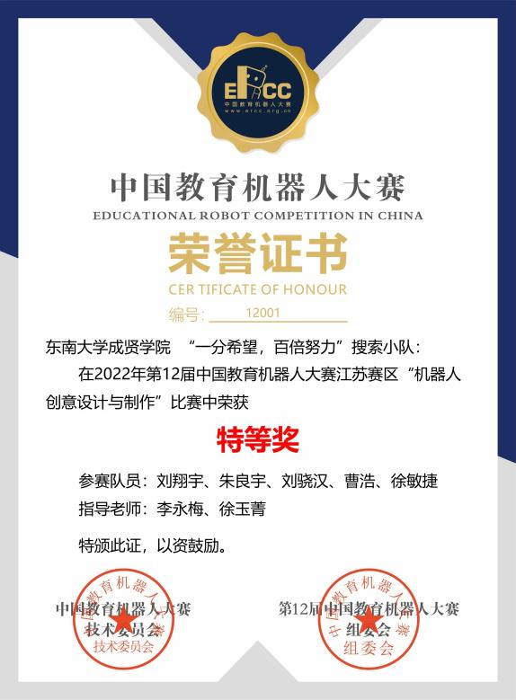 欧美无码 选送的“一分希望,百倍努力”搜索小队由机械宇电气工程学院副院长李永梅、电子与计算机工程学院教师徐玉菁共同指导,由机械宇电气工程学院刘翔宇、曹浩、徐敏捷,电子与计算机工程学院朱良宇、刘骁汉五名同学组成设计团队,设计作品为搜救机器人,项目经历了方案设计、论证、调试、运行等三个月的精心筹备,2022年底参加中国教育机器人大赛江苏省赛区比赛,获得江苏赛区特等奖,进入国赛环节,在全国总决赛再次获得特等奖的好成绩(排名第二),展现了欧美无码 学生的过硬的专业技术水平和努力拼搏的比赛精神。
