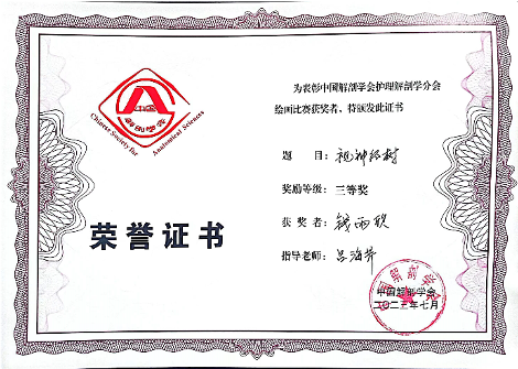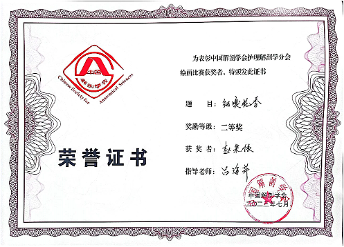 医学生护理解剖学绘画比赛旨在弘扬解剖文化,激发学习解剖的兴趣,发挥绘画在医学基础教育中的作用,丰富第二课堂,培养医学生综合素质。医学生护理解剖学绘画大赛目前已举办了5届,本届大赛共有来自全国120个医药院校选送的511幅作品参赛。经过初评和终评,最终决出一等奖作品17幅、二等奖作品34幅及三等奖作品51幅。我院护理专业2020级赵朱依同学的作品《细嗅花香》和护理专业2021级钱雨欣同学的作品《视神经树》分别荣获二等奖和三等奖。