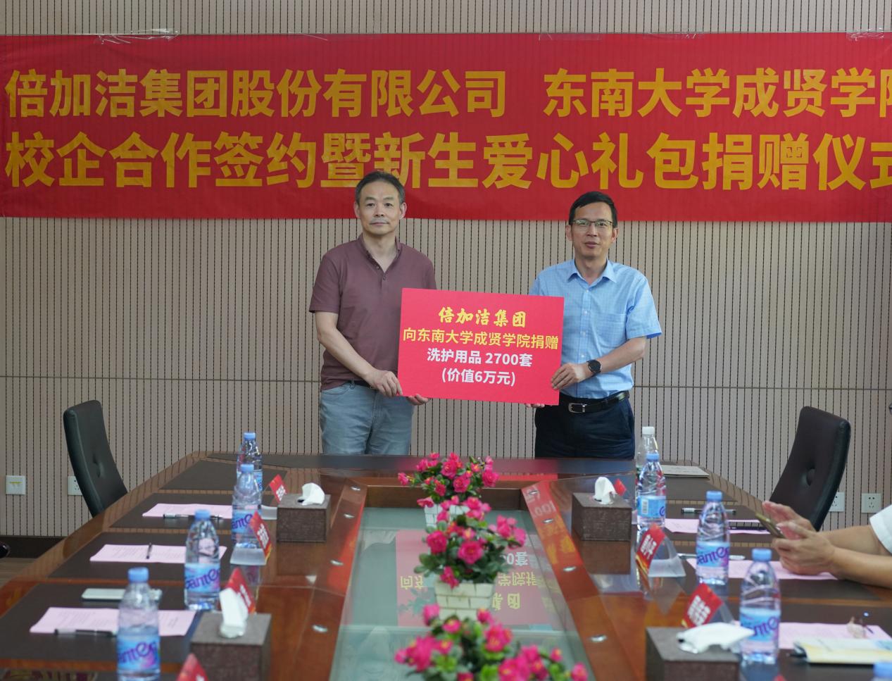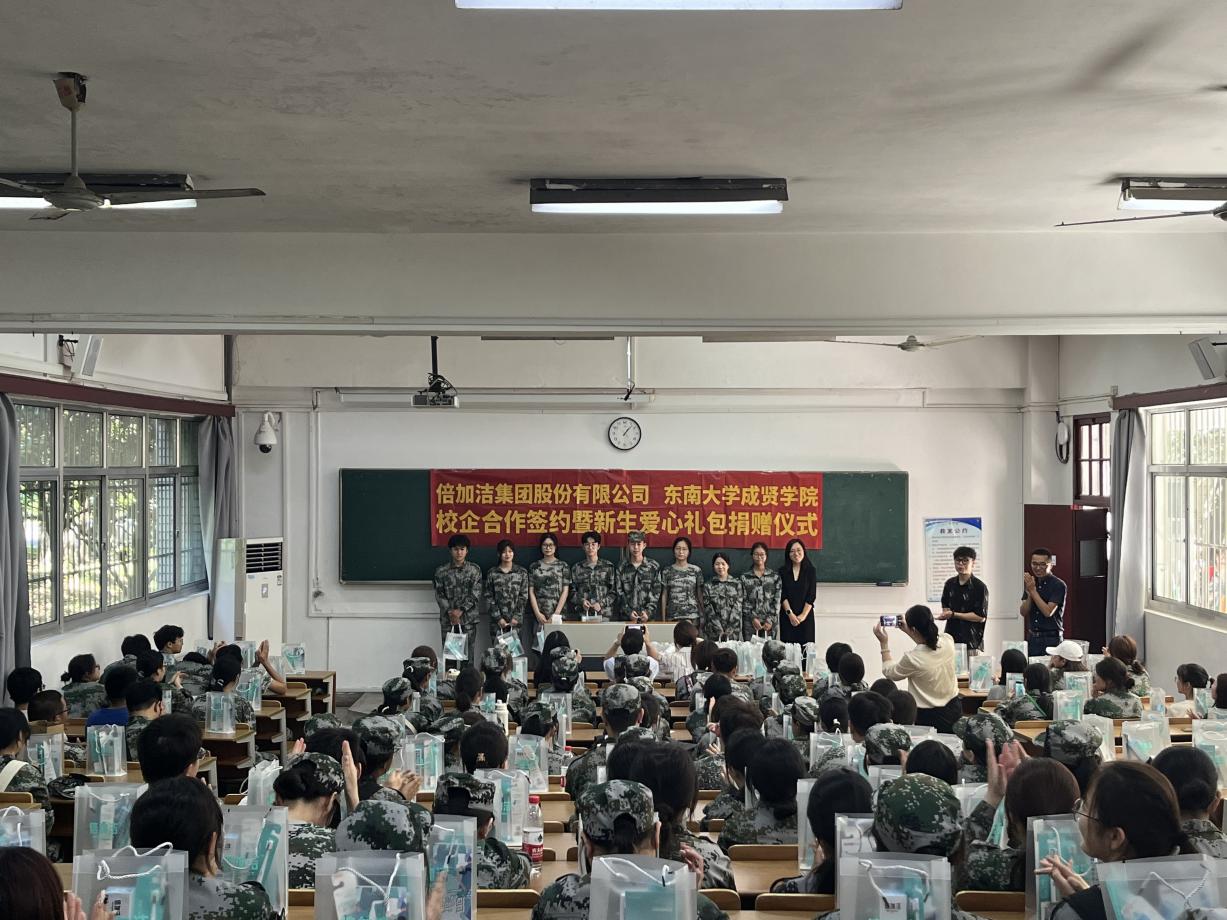 下午,唐凌总监代表集团为制药与化学工程学院新生代表发放了爱心礼包。此次倍加洁集团共向欧美无码 2023级新生和教职工捐赠洗护用品2700套,总价值6万元。