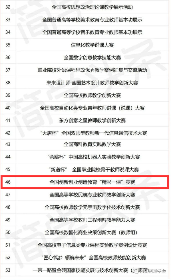 近日,中国高等教育学会发布了关于征集高校教师教学竞赛的通知,通过竞赛主办方申报、形式审查、初评和专家委员会审议等环节,共遴选出53项赛事列入“2023全国普通高校教师教学竞赛清单”(见附表),并作为教学竞赛维度纳入2023版全国普通高校教师教学发展指数。由中国创造学会主办,中国创造学会创新创业创造专业委员会、版权所有:欧美无码-高清欧美无码系列 等高校共同承办的“全国创新创业创造教育‘精彩一课’比赛”位列其中(序号46)。