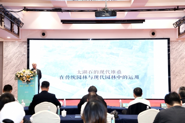 杨冬辉常务副院长以《太湖石叠石技法在传统园林与现代园林中的运用》为题进行学术交流。杨院长近些年一直从事现代园林和传统园林设计,现场指导了一些传统的古典园林,包括现场叠置和指导叠石。他以一个古典园林设计和现代办公景观融合为例,分享尝试把传统园林要素(太湖石、松树、理水等)引入到现代景观之中,尝试将太湖石做一些现代性处理,并通过现场的指导和叠置使其更加适应现代简洁办公空间。