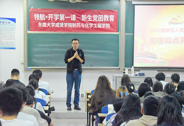 10月15日,学院举办领航·开学第一课——新生党团教育,制药与化学工程学院党总支书记周继荣、分团委书记刘庆分别以《用信仰点亮人生——新生入党启蒙教育》《不忘初心——做新时代合格团员》为主题对新生进行思想教育,要求同学们提升政治觉悟,端正入党动机,加强对党团知识的学习和积累,铸牢永远跟党走的思想根基和行动自觉,为实现中华民族伟大复兴的中国梦奉献力量。