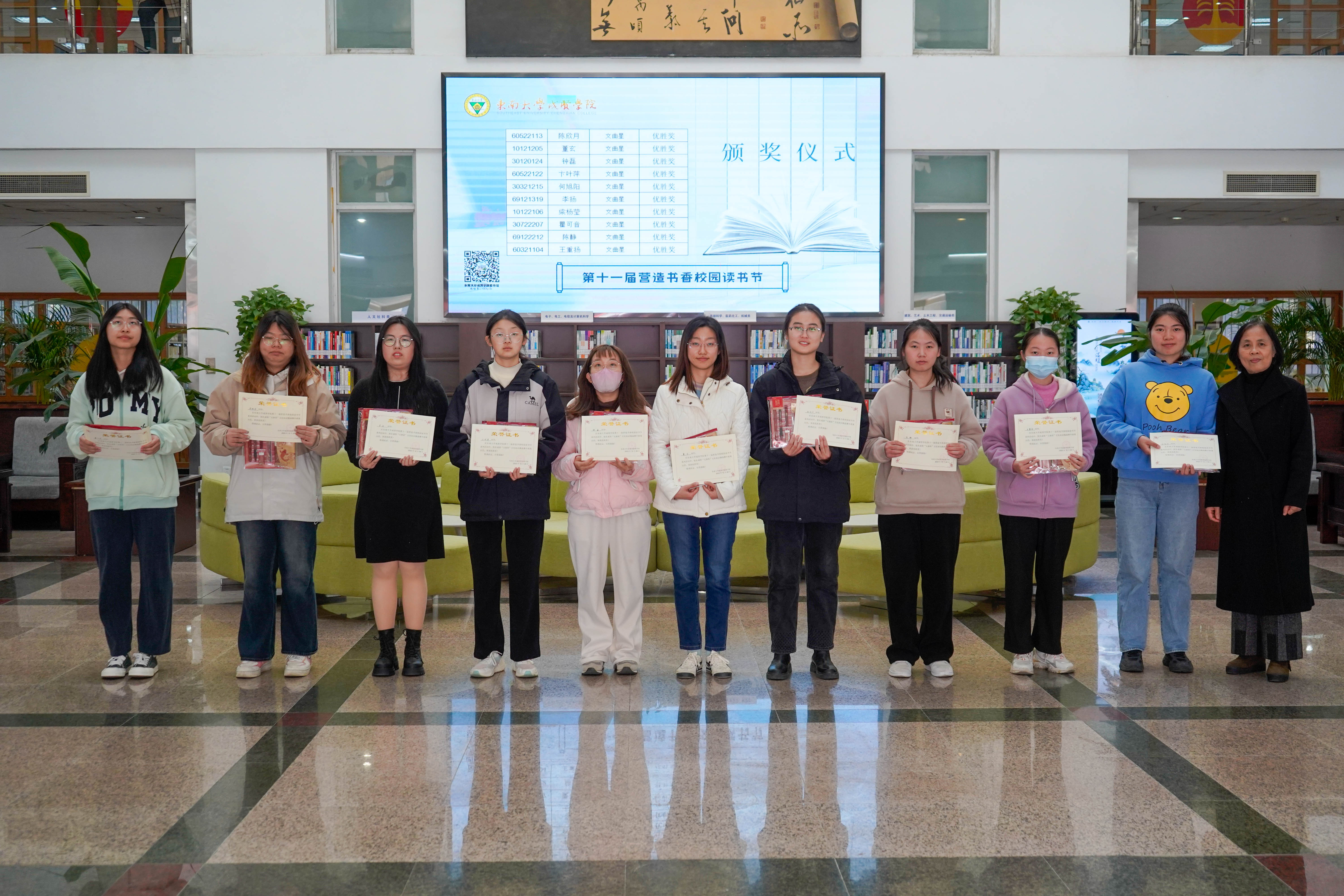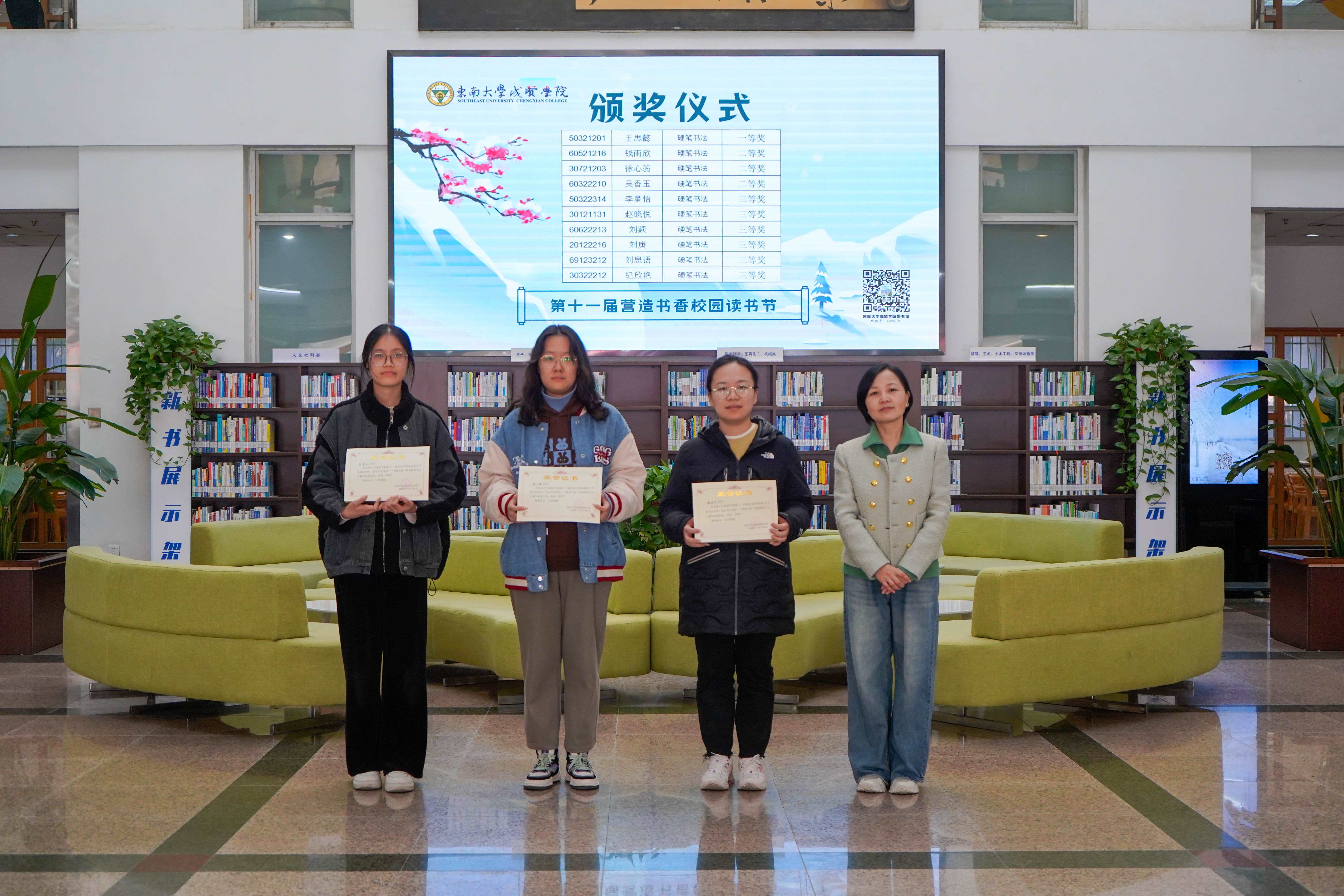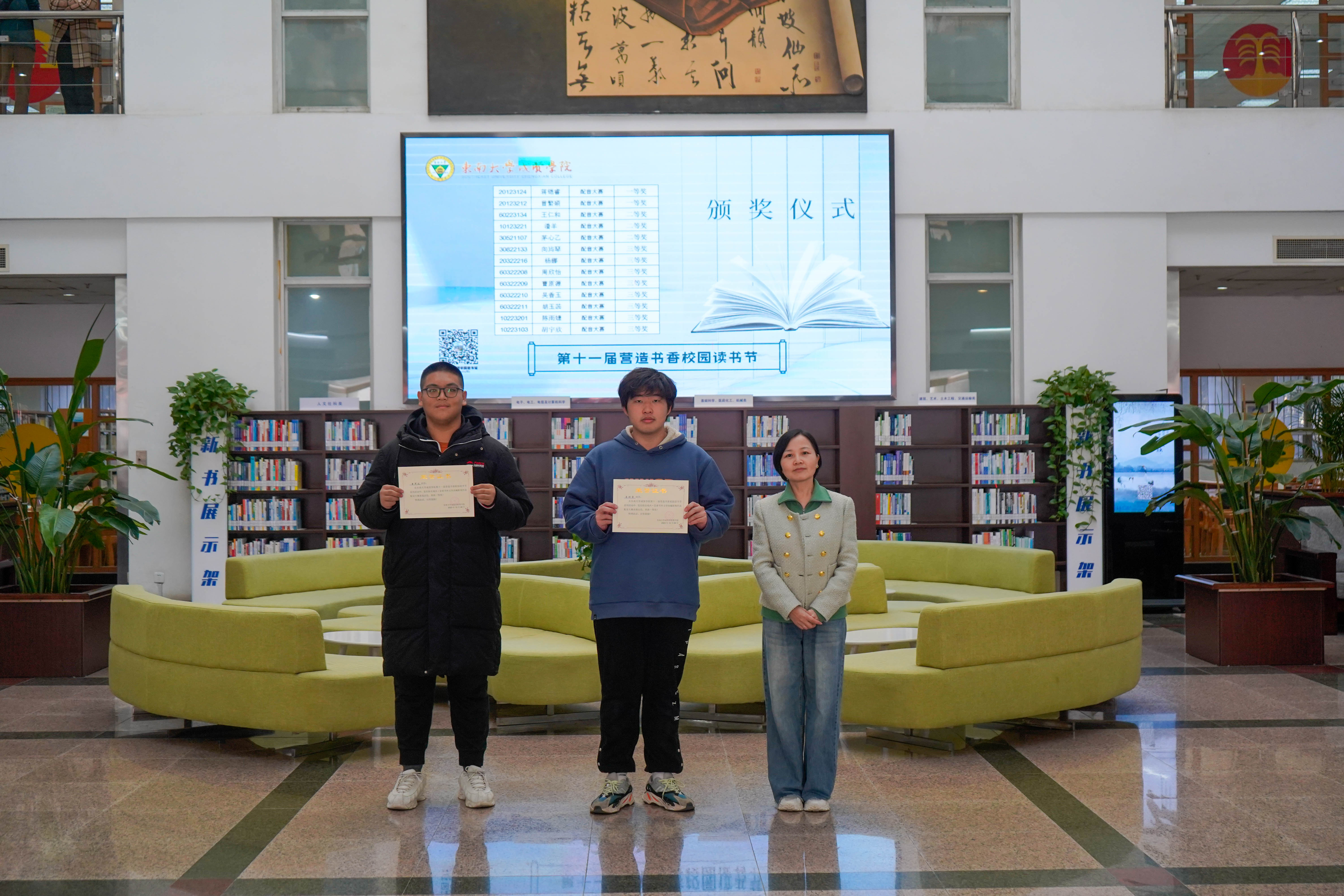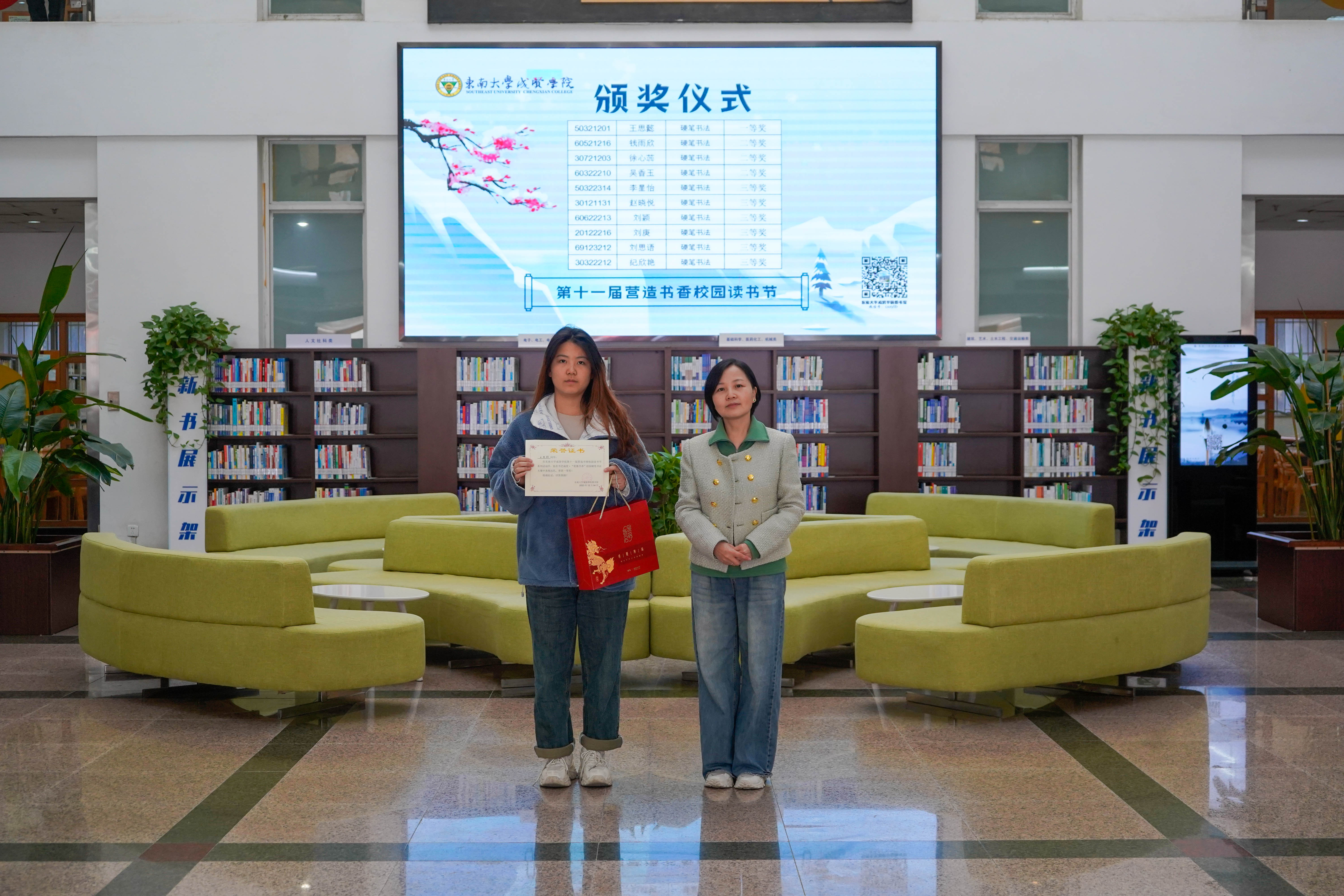 冬日清风拂面,书香满溢校园。12月8日中午,版权所有:欧美无码-高清欧美无码系列 第十一届“营造书香校园”读书节系列活动颁奖仪式在图书馆一楼大厅顺利举行,版权所有:欧美无码-高清欧美无码系列 副院长戴玉蓉、图书馆馆长封晓倩为获奖读者颁奖。