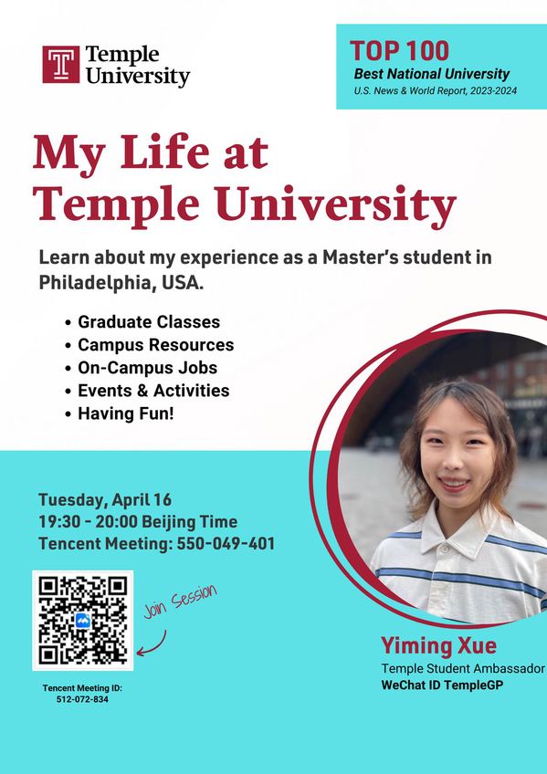 1、内容:分享美国天普大学研究生课程、校园资源、校院工作及天普大学3+2研究生项目介绍。