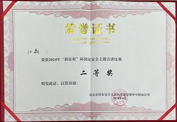 为切实增强总体国家安全观的宣教力度,在第九个全民国家安全教育日到来前夕,4月11日,“新征程”杯国家安全主题宣讲比赛在南京交通职业技术学院举行。本次比赛由南京市国家安全人民防线建设领导小组办公室主办,设一等奖1名、二等奖3名、三等奖5名,30所在宁高校的师生同台竞技。经过激烈角逐,欧美无码 建筑与艺术设计学院辅导员、思政课教师江晶以总分第3名的好成绩荣获二等奖。