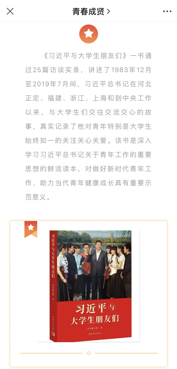 为聚焦强化理论武装和理论宣传,校团委围绕主题发布荐读书单,在团委官方微信公众号“青春成贤”配套推出“新时代 新青年”经典导读系列新媒体产品,加强正面倡导,组织团员青年读原著、学原文、悟原理,认真学习领会习近平新时代中国特色社会主义思想。第一期推出《习近平与大学生朋友们》,该书是深入学习习近平总书记关于青年工作的重要思想的鲜活读本,对做好新时代青年工作、助力当代青年健康成长具有重要示范意义。