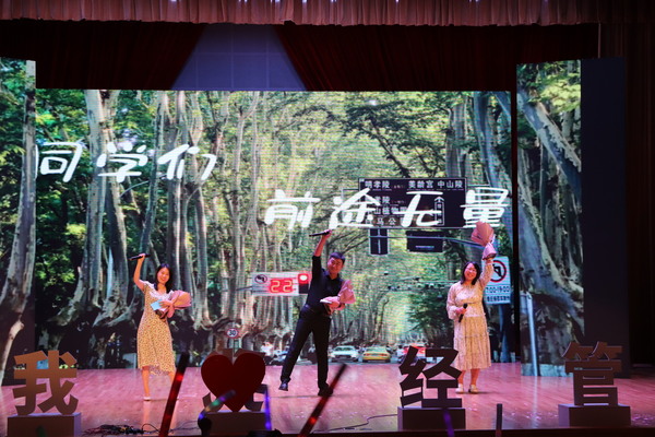以美育人、以文化人,迎新晚会深植中华优秀传统文化沃壤,大力弘扬中华美育精神,由“初秋伊始,星辰初遇”“青春绽放,梦想起航”“携手经管,逐梦成贤”三个篇章组成。每一篇章以原创设计开启,涵盖合奏、歌舞、情景剧等多种表演形式,情感细腻的台词、充满活力的舞蹈和动听的音乐交织在一起,为广大师生呈现出一幅幅青春校园的缤纷画卷。活动在《最炫民族风》中拉开了序幕;歌舞《新贵妃醉酒》广袖舒展,红扇翻飞,感古典之魅力,传国潮之优雅;小品《军师恋盟》饶有风趣,以一场别开生面的恋爱观教育课,引得台下笑声不断;晚会现场回顾了分团委新媒体中心精心制作的军训视频,带领新生重温共同奋斗的时光,感悟自己的成长;歌曲《小美满》将晚会的氛围推向高潮,辅导员用歌声表达了对同学们满满的期望,诠释了立德树人的情怀与追求。