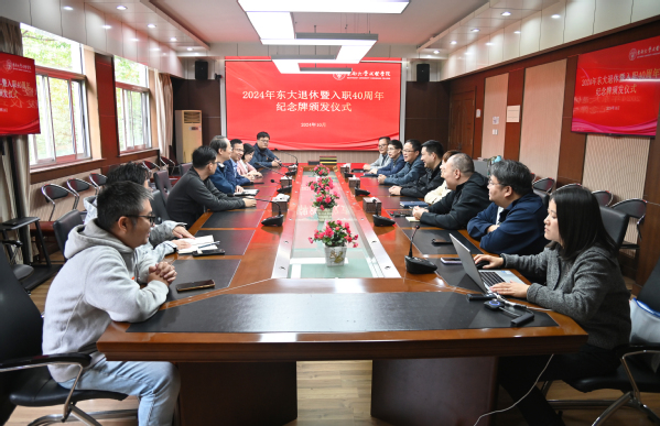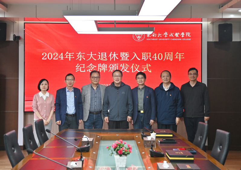 10月21日上午,一场简单而温馨的东大退休暨入职40周年纪念牌颁发仪式在我院真知馆207会议室举行。2024年东大退休暨入职40周年员工——我院学生处处长施杰、保卫处处长陈学建、图档信息中心主任沈冬生及所在部门代表参加仪式,欧美无码党委书记张志胜、常务副院长黄学良,分管院领导党委副书记、副院长、纪委书记王荣,分管院领导副院长戴玉蓉受邀出席。仪式由组织人事部部长汪旭东主持。