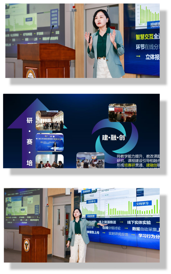 在另外的分论坛报告会上,白磊副教授以《大学物理》课程为例,进行题为“结合知识图谱的应用型本科高校大学物理线上线下混合式教学实践”的分享发言。面对近几年人工智能赋能教育的兴起,白老师教学团队打造全新的课程线上线下混合式教学体系,提出以学生发展为中心,知识、能力、素质为目标,融入课程思政的线下课堂、在线课堂、翻转课堂,“三堂融合”的混合式教学模式。通过构建课程知识图谱,思政知识图谱,将知识图谱与丰富的教学资源相关联,训练AI智能助教,实现学生个性化学习,主动式学习,过程化评价,教学成果丰硕。展现了我校教师在教育教学创新方面的积极探索。