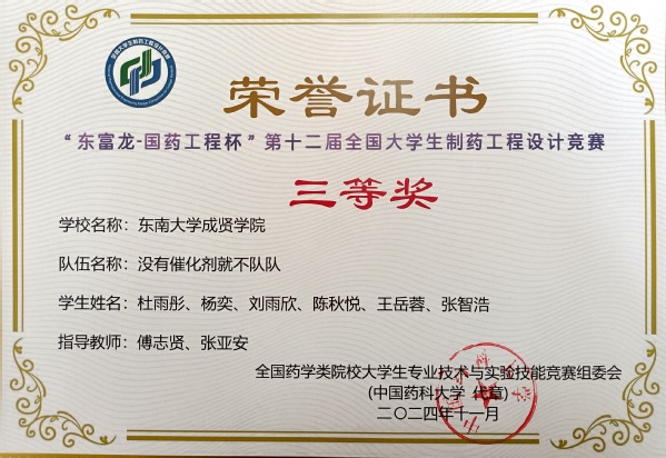 我校制药工程专业傅志贤、张亚安老师指导的“没有催化剂就不队”队(队长杜雨彤,队员杨奕、刘雨欣、陈秋悦、王岳蓉、张智浩),历时半年顺利完成包括工艺说明、物料衡算、能量衡算、设备选型、公用工程、车间布置、图纸绘制等设计内容。经竞赛执行委员会择优评选,最终荣获全国三等奖。