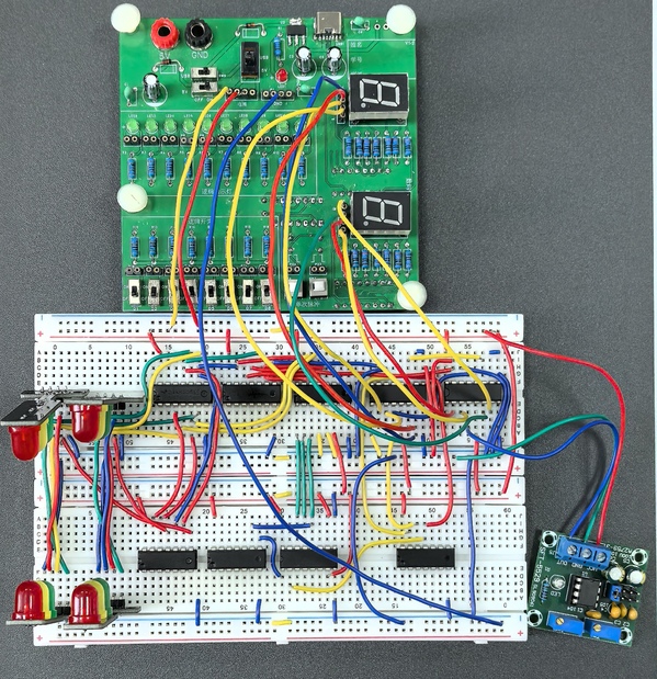 简易交通信号灯的设计与实现,首先需要同学们设计方案,针对设计的方案进行仿真分析,在仿真结果正确的情况下进行硬件实物的购买和焊接。学生们实现的方案多种多样,包含使用实验箱搭接完、数电实验板搭接,以及制作PCB板焊接完成的(如下图)。针对学生完成情况,以及现场完成情况,老师的评分考核也是过程化,实现更准确地体现学生的真实学习情况。