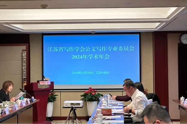 2024年12月28日,江苏省写作学会公文专业委员会2024年学术年会在南京召开。本次会议以“中国式现代化进程中的公文写作探索与实践”为主题,由江苏省写作学会公文专业委员会副会长、江苏省委研究室原副主任王兴亚主持。我校党政办公室副主任郑晨梓参加会议并作为代表发言。