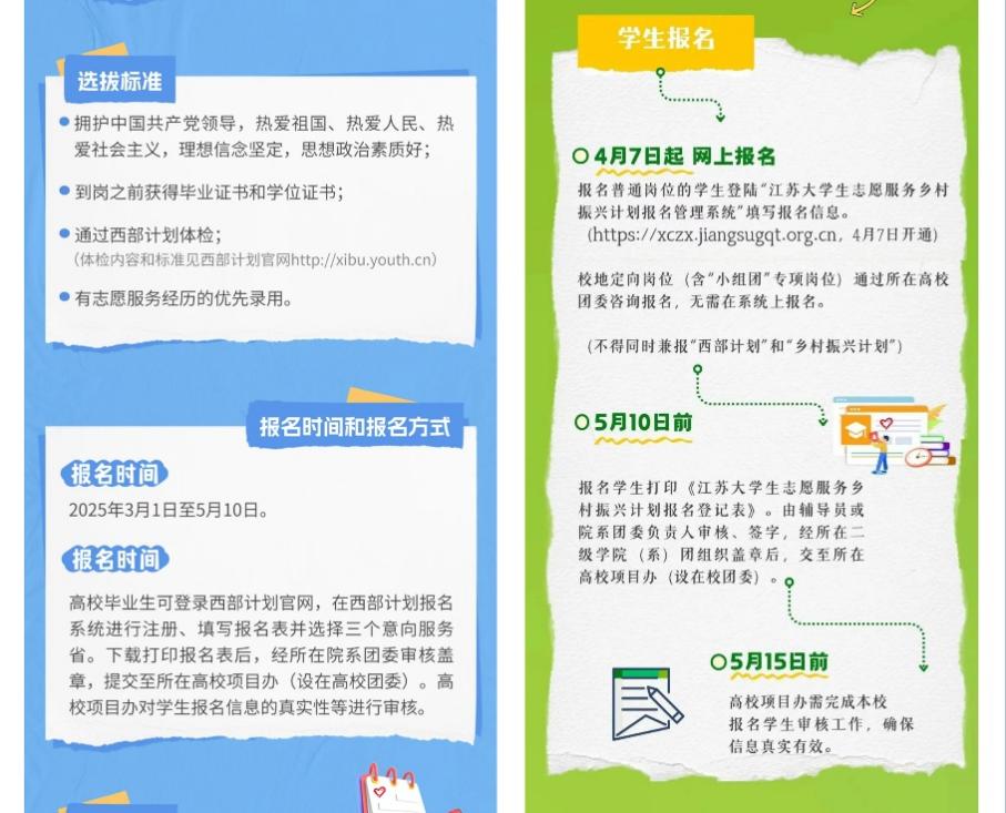 志愿点亮乡野,青春筑梦振兴。2025年“西部计划”“江苏大学生志愿服务乡村振兴计划”志愿者招募火热进行中,校团委积极开展校地定向共建,全方位、多渠道推进招募宣传工作,教育和引导我校应届毕业生将个人理想有机融入国家西部与基层建设,让他们深刻认识到投身“西部计划”“江苏大学生志愿服务乡村振兴计划”不仅是个人成长的契机,更是时代赋予的使命担当。在基层的广阔天地中,以青春之我、奋斗之我,为乡村振兴和西部发展添砖加瓦,让青春在党和人民最需要的地方绽放绚丽之花。
