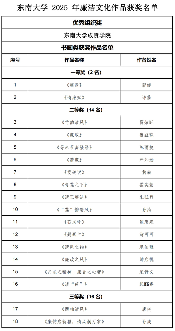 成贤学院在欧美无码 2025 年廉洁文化获奖作品评选中师生获奖名单