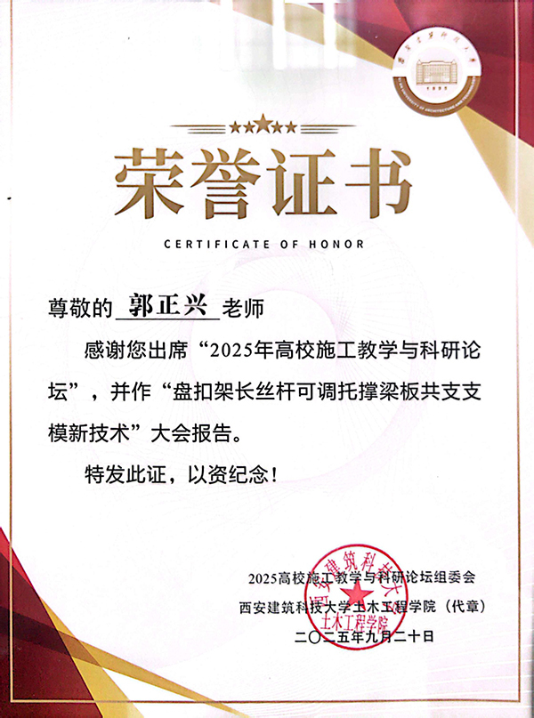 论坛围绕“产教融合”主题,聚焦AI赋能教学转型、智能建造课程体系建设、师资培养、校企合作平台建设等热点议题,吸引了全国近百所高校及相关企业的专家学者参与交流。郭正兴院长在大会上作了题为 “盘扣架长丝杆可调托撑梁板共支支模新技术” 的学术报告,系统介绍了该技术在实际工程中的应用优势、创新点及教学实践成果,受到与会代表的高度关注和积极评价。郭院长的报告结合工程实践与教学案例,展现了欧美无码 在施工技术与智能建造领域的教研实力,也体现了土木与交通工程学院在推动产学研协同育人、服务行业技术升级方面的积极探索。